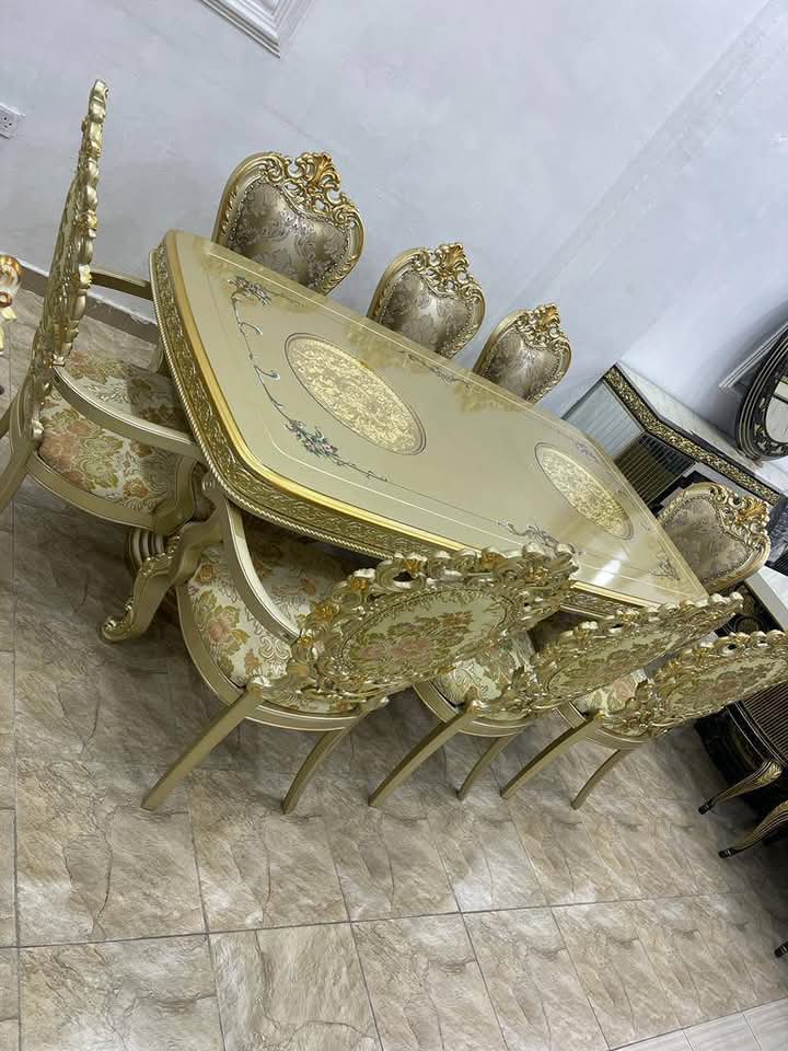 The spacious table comfortably accommodates eight people, making it perfect for large families, gatherings, or formal dining occasions. Each chair is elegantly upholstered with plush cushioning and intricate detailing, blending comfort with a truly majestic aesthetic. Built with premium materials, this set is not only visually stunning but also sturdy enough to serve you for years to come.