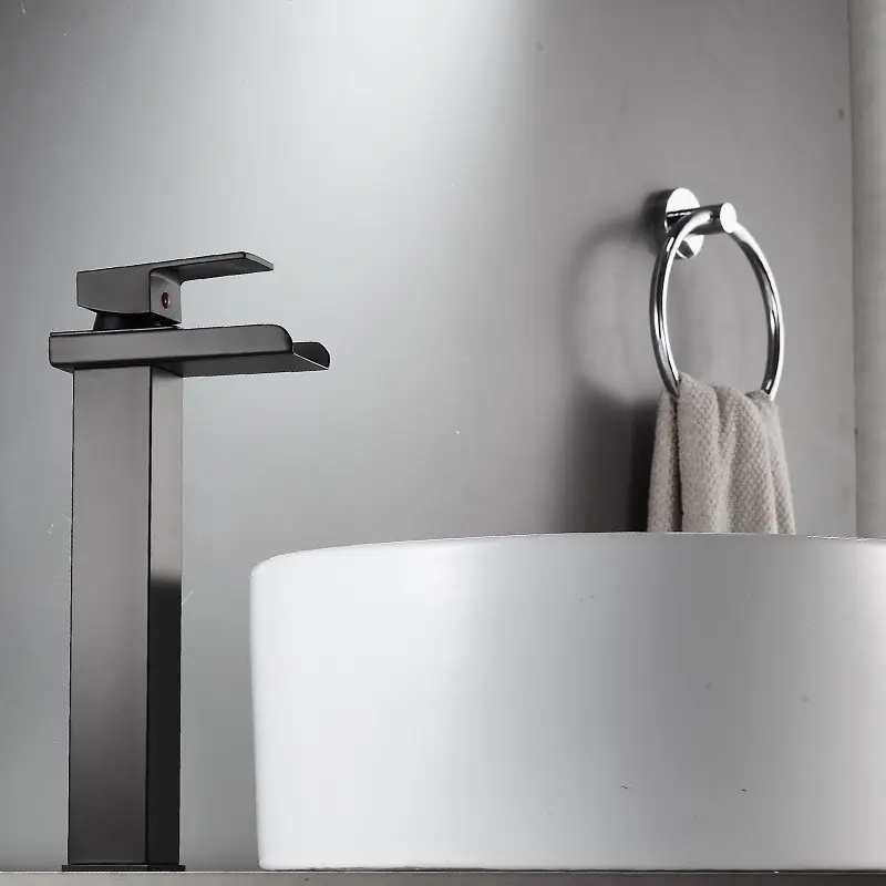 The Extended Black Half-Cut Waterfall Basin Mixer features a bold design, cascading water flow, and durable construction, making it a stylish choice for vessel basins.